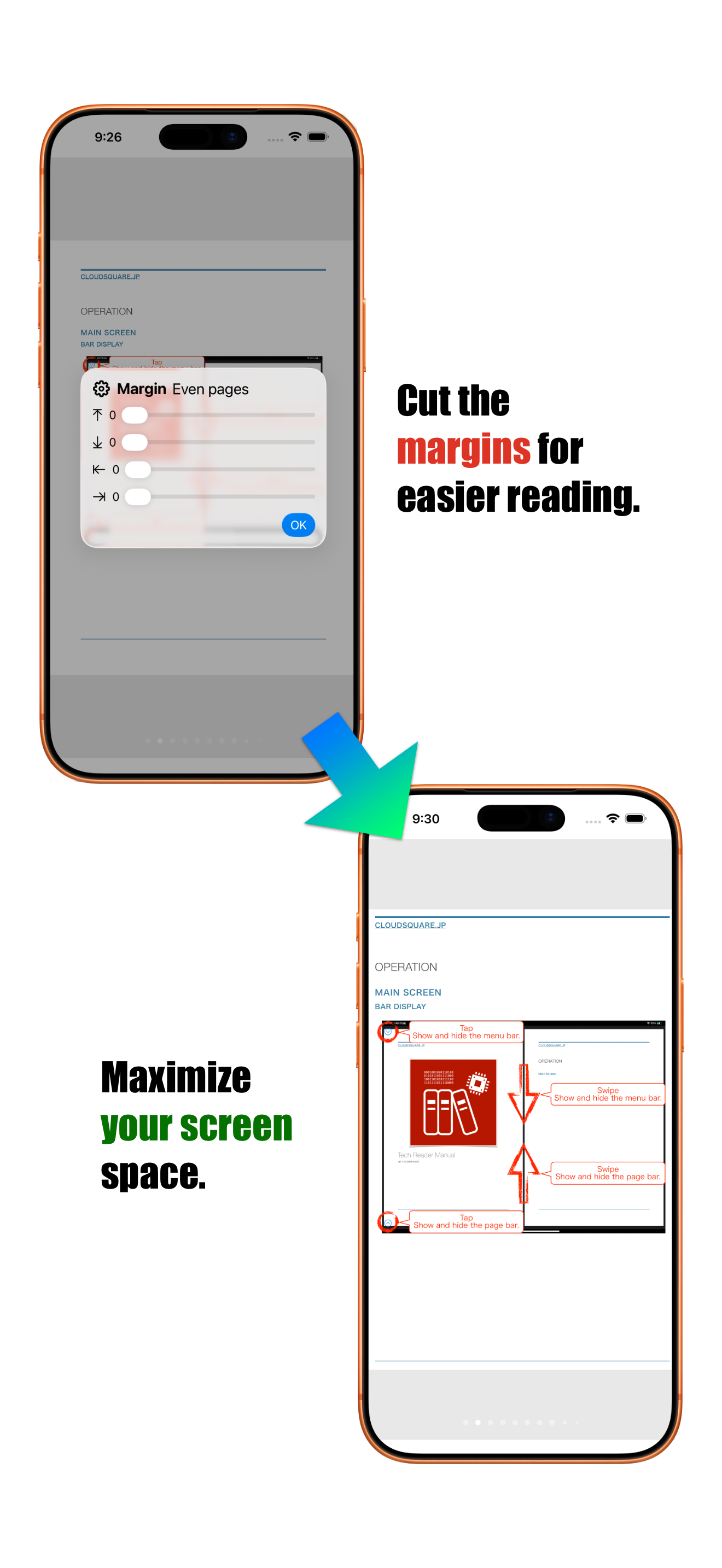 - 偶数ページ・奇数ページの余白カット幅を設定可能。