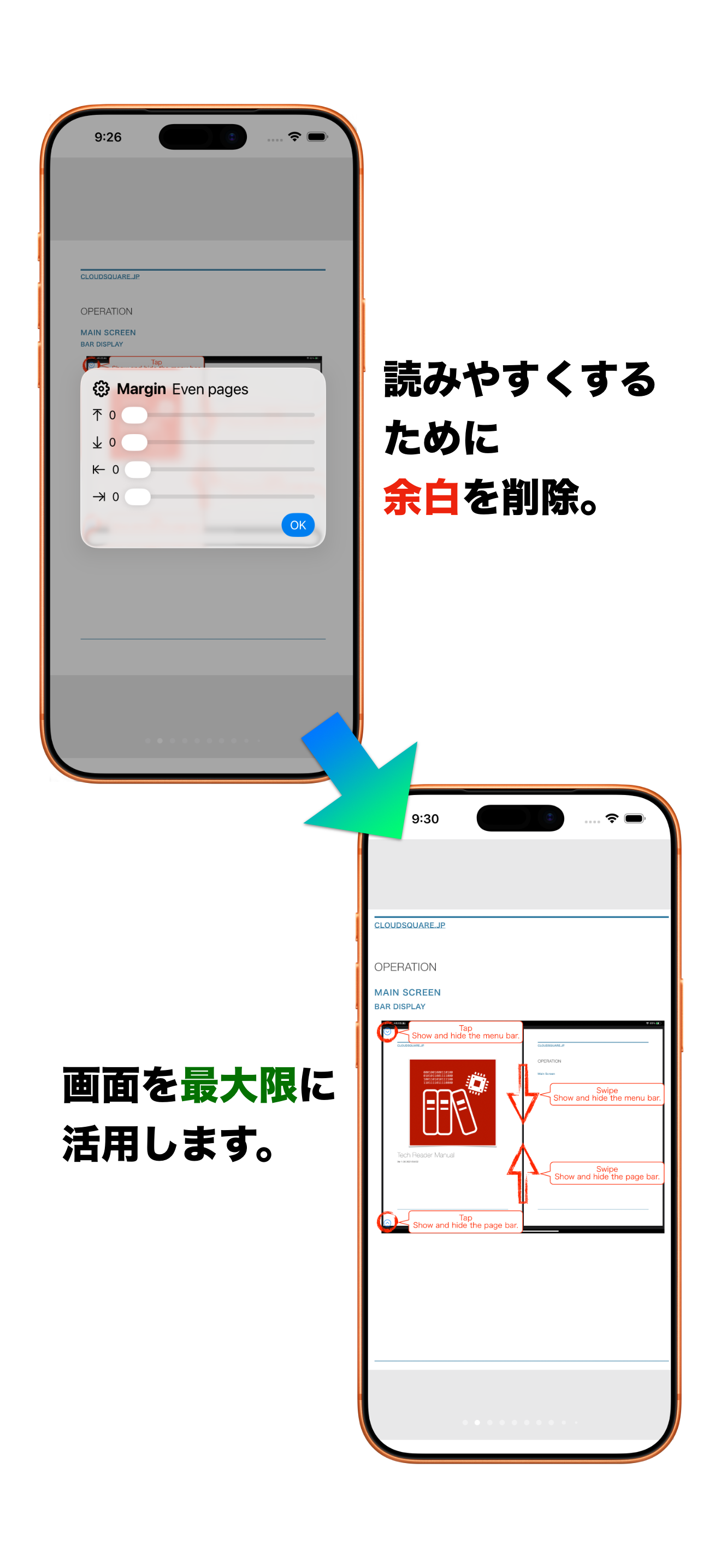 - 偶数ページ・奇数ページの余白カット幅を設定可能。